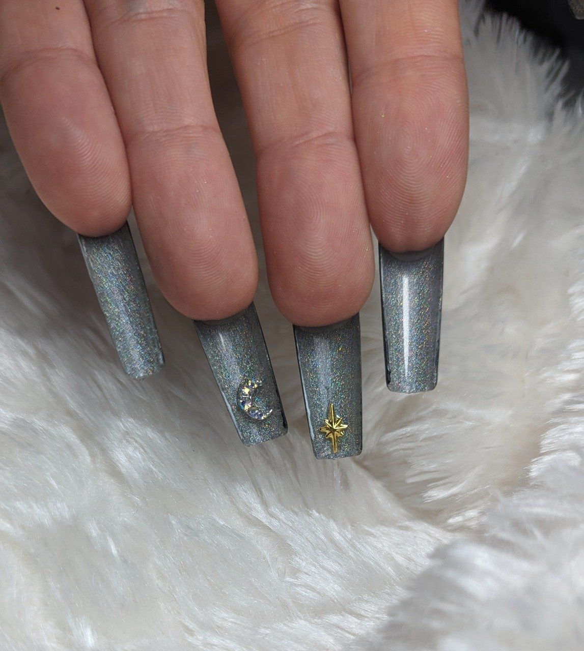 Forme aux choix, exclusivement longue, effet "Louboutin" gris holographique/noir , bijoux 3D dessus demi lune ou étoile